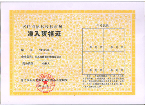 宿遷市相關部門對雙能太陽能進行了相應的審核,雙能憑借雄厚的企業資質及良好的信譽,被頒發宿遷市招標投標市場準入資格證。此證的獲得為雙能在宿遷工程市場的發展奠定了基礎。