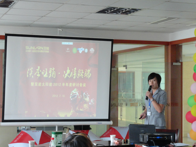 2012年7月18日,雙能公司在海安舉行了淡季旺銷•決勝終端暨雙能太陽能2012半年度研討會。雙能公司總經理吉德康、營銷總監王慧以及海安的全體經銷商參加了會議。
