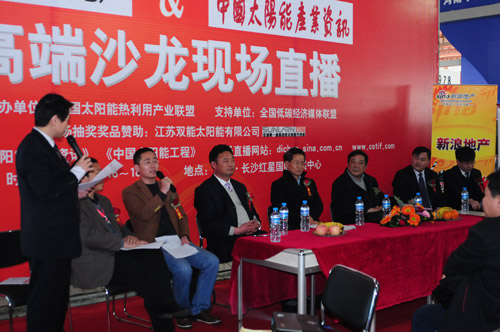 3月16日下午舉行高端沙龍第一場,主題為“樹信心 舉新措 保增長 促發展”, 中國太陽能熱利用產業聯盟副理事長、秘書長霍志臣及江蘇雙能太陽能有限公司常務副總經理賁道發作為嘉賓出席,五星、輝煌、力諾瑞特、日利達、桑樂等均派代表出席。