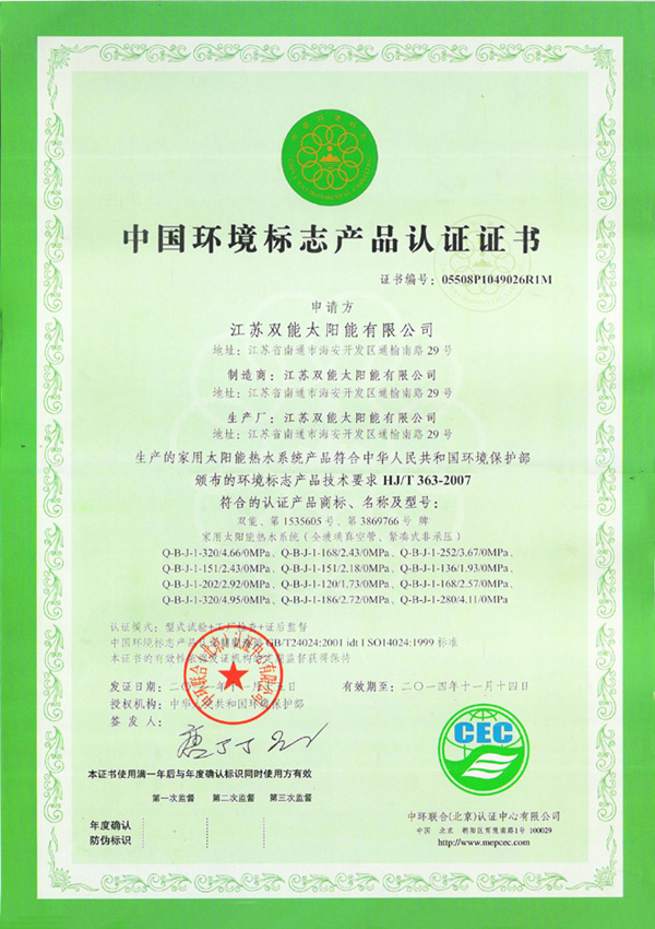 江蘇雙能太陽能有限公司順利通過財政部、環保部審核,取得“環境標志產品政府采購清單”通行證。