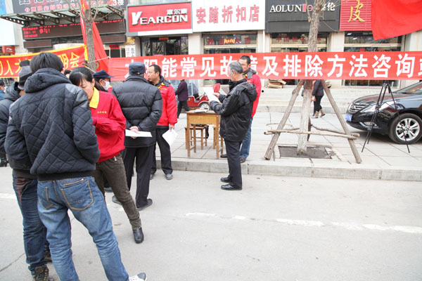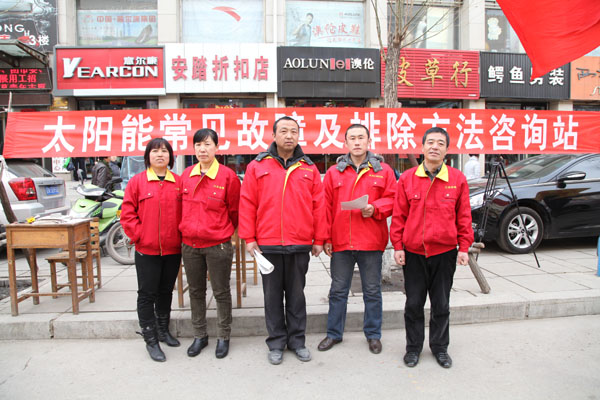 以“太陽能常見故障及排除方法咨詢”為活動主題 ,雙能人提前制作了宣傳條幅,印制了科普宣傳單。還沒到中午,所有單頁就被熱心的市民們一搶而光。在前來咨詢的人們口中知道,太陽能存在的故障的確不少,有的冬天凍堵,有的樓頂上跑水,有的水溫不高,還有的加不滿水等等問題。