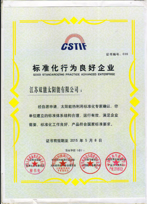 近日,雙能公司順利通過太陽能熱利用標準化專家組的審核與驗收,榮獲“標準化行為良好企業”證書,成為太陽能行業首批獲此認證的企業。該證書由中國太陽能標準化技術委員會秘書處、中國農村能源行業協會太陽能熱利用專業委員會、中國節能協會太陽能專業委員會、中國可再生能源學會產業工作委員會聯合會辦頒發。