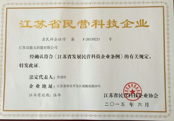 雙能太陽(yáng)能喜獲江蘇省民營(yíng)科技企業(yè)證書